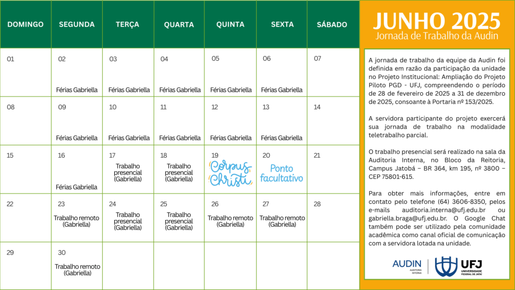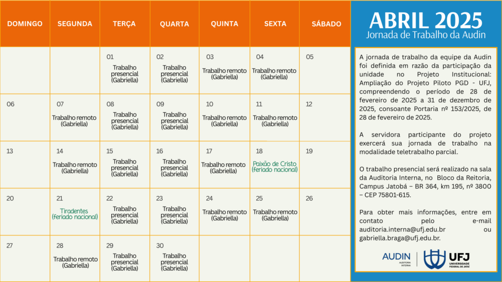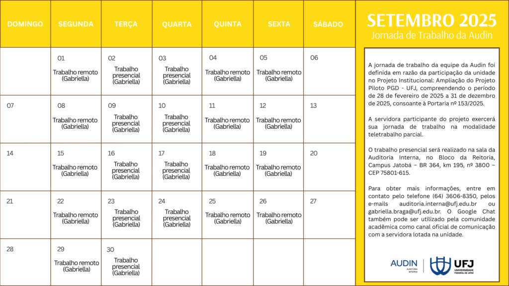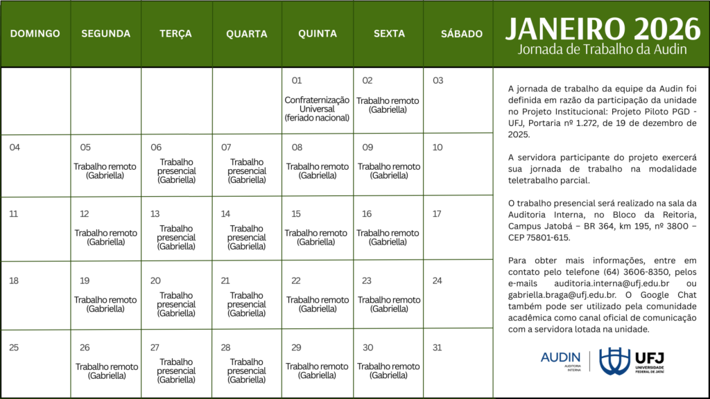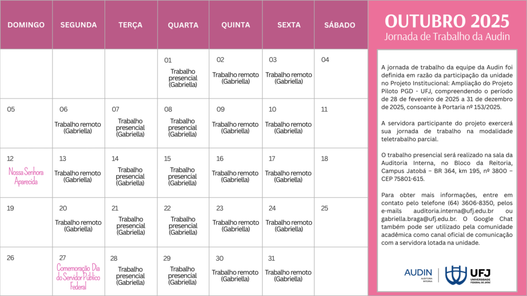 Esta seção apresenta as informações relativas à jornada de trabalho da equipe da Auditoria Interna, no contexto de sua participação no Projeto Institucional “Projeto Piloto do Programa de Gestão e Desempenho (PGD) – UFJ”, conforme disposto na Portaria nº 153/2025 e na Portaria nº 1.272/2025.